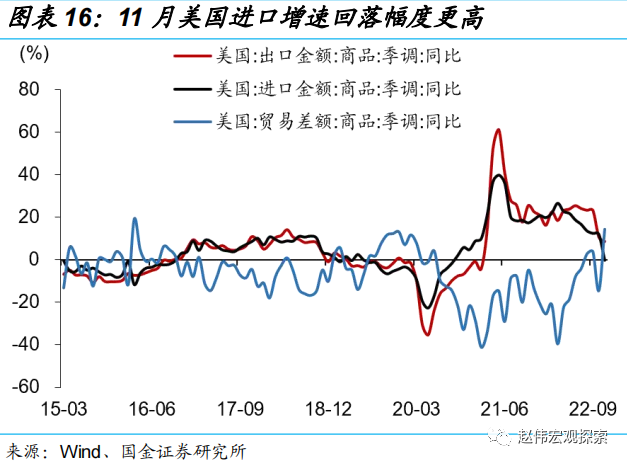 美国11月美国进出口增速双双回落,进口回落幅度更大,商品贸易逆差收窄。贸易结构上,各类商品进口普遍呈现疲软状态,消费品进口跌幅较大。11月商品贸易逆差为833亿美元,是自2020年12月以来的新低。
