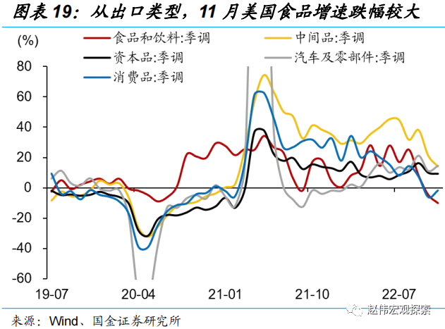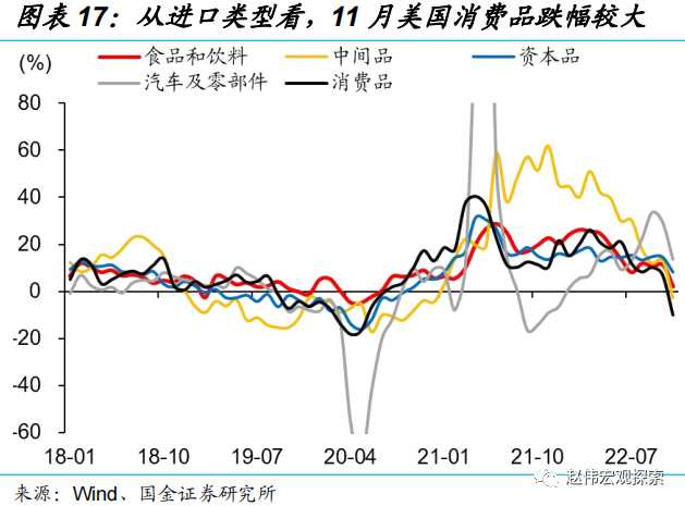 11月美国进出口增速双双回落,商品贸易逆差收窄。11月商品贸易出口增速8.48%(前值10.5%),进口增速-0.24%(前值11.94%),进口增速回落幅度更大。商品贸易逆差收窄至833亿美元,是自2020年12月以来的新低。结构上,各类商品进口普遍呈现疲软状态,消费品进口跌幅较大,消费品的进口增速-10%,中间品-2.8%,汽车及零部件进口增速较高,为13.8%。从出口结构来看,食品(11月-9.96%)和消费品(-1.76%)出口增速较差,中间品(14.2%)和汽车及零部件出口增速较高(14.6%)。
