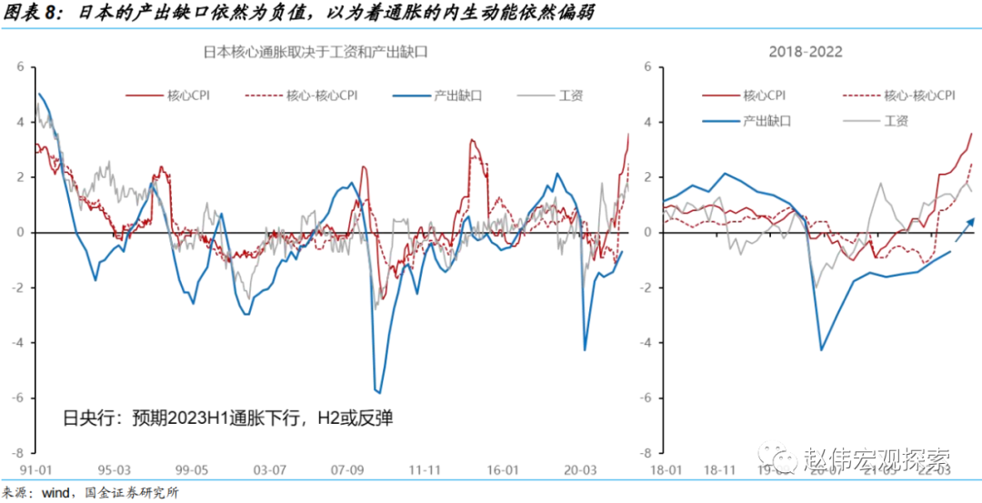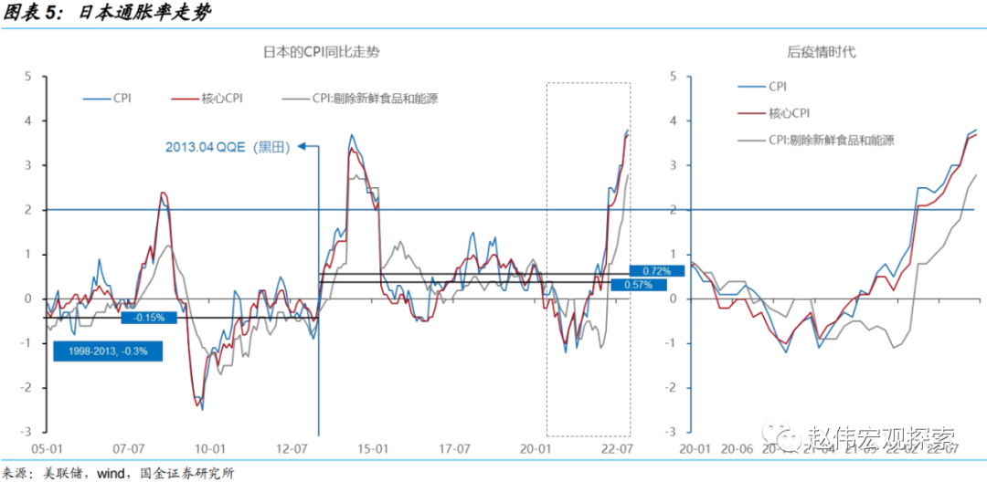2022年调整YCC的背景与2018年相似,只是海外加息节奏更快,全球和日本国内的通胀压力也更大,日央行也不得不更大幅度地上调YCC上限。2022年11月,日本核心CPI通胀已经上升到3.7%,但与全球口径相同的核心-核心CPI通胀率(提出新鲜食品和能源)仅为2.8%[4]。