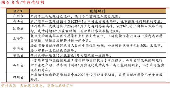 根据各省/市的疫情研判,各地的疫情峰值已提前到来。例如,广州市、上海市、三亚市、海口市疫情已达峰,四川省,安徽省大部分地区12月底前或1月初达峰,江西省可能于2023年1月上旬达峰。百度疫情指数数据显示,全国百度健康问诊指数和百度疫情搜索指数均于12月21日达峰,22日起出现回落,绝大部分城市的疫情已经达峰。从核心城市来看,北京、石家庄、重庆、广州、上海、深圳等城市疫情搜索指数在12月22日前均已达峰。另外根据12月31日数据,百度指数覆盖的全国360个城市中,90%的城市将在2023年1月前结束搜索高峰,57%的城市将在春节前(1月21日)结束搜索高峰。
