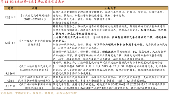 2)汽车等消费领域,商务部在12月29日表示,将着力稳定汽车消费,支持新能源汽车购买使用,加快活跃二手车市场。支持餐饮等行业恢复发展,促进家电家居消费,推动绿色智能家电下乡和以旧换新。《“十四五”扩大内需战略实施方案》中也重点提及释放出行消费潜力,包括鼓励限购地区探索差异化通行管理等替代限购措施、加强停车场、充电桩、换电站、加氢站等配套设施建设、大力推广新能源汽车、实施智能网联汽车示范应用工程,创建车联网先导区等。2022年以来,全国层面的刺激汽车消费政策频出,地方层面多以发放消费券的方式对消费者进行购车补贴,惠及领域包括新能源汽车和燃油车,预计后续会有更多城市跟进。