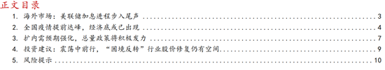 板块配置上,我们认为“困境反转”行业股价仍有修复空间,建议关注三条主线:1)受益于疫后修复的消费领域,食品饮料、医药、航空机场、酒店、免税等;2)产业政策支持的成长板块,军工、信创、自主可控等;3)受益于政策边际调整的,地产相关产业链等。
