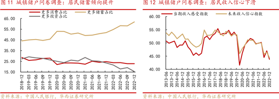 当前国内经济受疫情扰动,居民预期偏弱,对未来的收入信心下滑,储蓄意愿持续提升。央行公布的2022年第四季度城镇储户问卷调查报告显示,居民四季度收入感受指数为43.8%,未来收入信心指数为44.4%,分别较上季度下降3.2个百分点和2.1个百分点。从消费、储蓄和投资意愿来看,倾向于“更多储蓄”的居民占比61.8%,比上季增加 3.7 个百分点,并位于2002年以来最高。