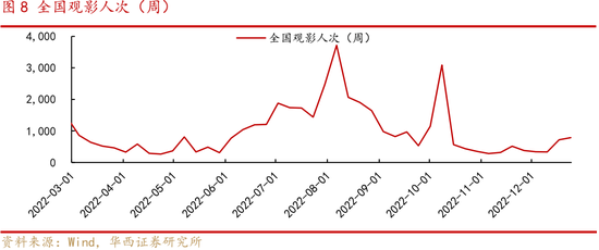 疫情防控措施的放宽使得居民出行流动的限制减少,疫情达峰城市的出行数据已率先修复,消费复苏节奏有望提前。根据统计,百城拥堵延时指数平均值于12月24日触底,随后反弹修复;地铁客运量方面,疫情相对较早达峰的北京市地铁客运人次较早触底,较晚达峰的成都、广州、上海和深圳地铁客运人次较晚触底,但均已进入回升趋势;电影消费方面,全国观影人次于12月10日当周触底后出现反弹。后续随着居民出行的恢复,全国的消费复苏节奏有望加快。
