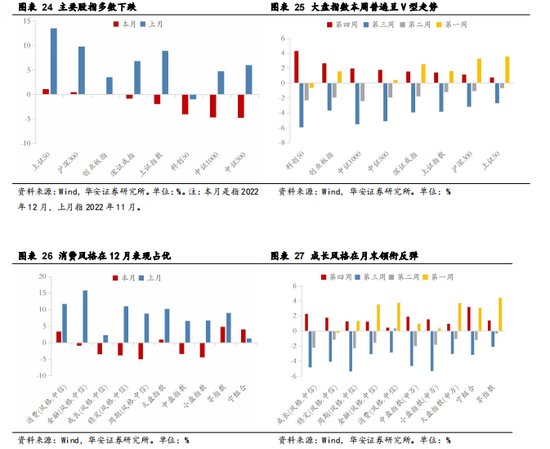 另一方面,国内基本面与政策则在12月继续主导了A股行情,从时间轴来看:①12月上旬,中央及各地方防疫优化政策加速落地,速度与力度均超出市场预期,引导A股独立反弹;②12月中旬,随着中央经济工作会议等一系列重磅会议陆续步入尾声,市场开始反馈会议所释放的政策信号,A股逐步回落;③12月下旬,国家防疫政策再迎重大调整,国家卫健委发布《关于对新型冠状病毒感染实施“乙类乙管”的总体方案》,彻底放宽防疫限制、开放出入境政策,引导市场情绪修复,A股小幅反弹。