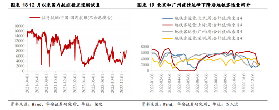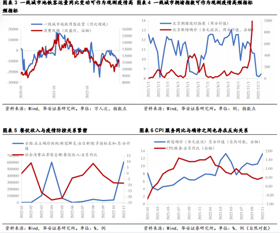 虽然可以通过百度搜索指数以及模型等推算各地疫情达峰以及进入平台期的大致时间,但从增长层面,我们更关心疫后消费复苏情况。我们认为,1月份消费复苏可以从三个维度的指标进行跟踪:①地铁客运量、拥堵指数可作为观测大城市的高频指标。疫情主要影响居民的生活半径,因此通过地铁客运量、拥堵指数,可以观测居民出行情况,作为疫情影响是否退散的指标。并且上述数据为日数据(或变频处理为周数据),可以及时跟踪相关情况。②餐饮收入与服务类CPI可作为月度后验指标。居民外出就餐同样作为疫情影响退散的重要指标,但考虑到餐饮收入同比增速数据公布通常滞后至下月中旬公布。因此,可以作为月度级别的后验指标。服务类CPI也具有类似的指引作用,且公布数据早于餐饮收入同比增速,但指引性略弱。需要注意的是2023年1月份不公布餐饮收入同比增速,服务类CPI需要2月上旬公布。③春节客运量与消费数据有望成为观测Q1消费是否显著复苏的重要指标。虽然2022年春节期间,政策端有意放松了返乡过年相关的防疫要求,但从事后数据来看,2022年春节期间旅游、出行等仍明显低于疫情之前,电影票房抛开涨价因素外也不及疫情之前。如本轮疫情能够较快地实现疫情达峰,叠加前几年返乡意愿高涨、政策端限制明显下降,有望推动今年形成较大规模的“返乡潮”,从而成为今年消费复苏“开门红”的重要因素。加之今年春节较为靠前,后续可密切跟踪春节数据,研判消费复苏的节奏。