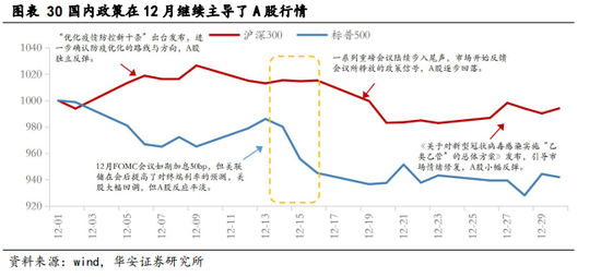 国内政策逐渐替代海外变量成为行情内核。一方面,美联储加息预期的频繁反复对美股12月走势形成了明显掣肘,但对A股的影响则相对收敛:12月15日,12月FOMC会议如期加息50bp,但会后更新的点阵图则显示美联储提高了对终端利率的预测(预测中值从9月的4.6%提高至5%以上),引发市场对美联储提高货币紧缩力度的担忧,美股大幅回调,但隔日A股反馈则比较平淡。