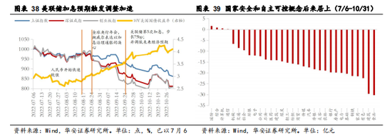 普跌格局下国家安全和自主可控概念后来居上。在外资快速流出的背景下,食品饮料、电力设备等外资重仓行业跌幅居前,而带有自主可控和国家安全概念的计算机和国防军工在“二十大”提出推进国家安全体系和能力现代化后表现突出。