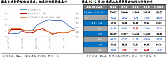 疫情扰动下投资端和地产销售均有所放缓。12月,受供应下降影响钢材价格小幅反弹,但与基建、地产施工强相关的水泥价格明显回落,疫情达峰对开工、施工的限制较为明显。同时,疫情影响居民线下看房,30个大中城市商品房销售面积增速年末明显下降,尤其是疫情交早爆发的一线城市,预计这种情况可能持续到2023年春节期间。我们认为,投资端仍旧依靠基建与制造业投资支撑,地产投资短期内难见起色。以南京放松限购为标志,后续地产需求端调控政策有望继续放松,但效果有待观察,尤其是房地产调控政策见效仍需购房者对经济、就业和收入信心回暖。