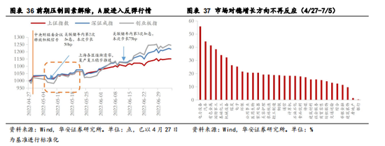 阶段二(4/27—7/5): 前期压制因素解除,A股进入反弹行情。此阶段,受多重利好催化驱动,前期压制经济基本面与市场风险偏好的几大因素陆续削弱、解除,逐渐引导A股进入反弹节奏:第一,重要会议定调坚持经济增长目标,中央财经委员会在4月26日召开会议研究全面加强基础设施建设问题,会议释放了要适度超前建设的信号,被A股市场解读为仍将坚持5.5%的增长目标,成为A股反弹的起点;第二,全球市场对美联储加息预期逐渐稳定,市场在鲍威尔不断解释政策意图的过程中逐渐形成了对美联储加息的稳定预期,削弱了美联储加息所产生的边际影响;第三,上海疫情压制因素解除,上海疫情在5月进一步得到控制,各区县逐渐完成社会面清零目标,复商复市和复工复产稳步推进,基本面扰动项解除。