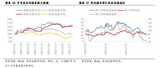 ②成长风格当前已具备性价比,成长风格中新能源赛道仍值得配置。在经历岁末消费、金融起成长弱的跷跷板行情后,当下成长风格已具备相当性价比,左侧参与机会已经显现。截至2022年12月30日,光伏、风电和储能的PE_TTM分别为23.86 X、24.78 X和46.58 X,新能源赛道中的风光储目前估值水平已到2020年以来的绝对低位水平,值得布局参与。未来仍会维持宽松的流动性环境,央行降息值得期待,在流动性方面也对成长风格的表现形成支撑。因此,可加大对新能源链条风光储和电池上游材料、中游制造等方向的配置。
