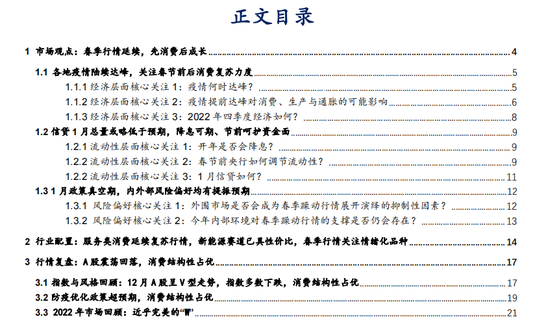 1)1月疫情有望达峰回落,推荐配置服务类消费中的出行链条、线下消费及白酒等食饮消费品和需求恢复的医疗服务。推荐服务类消费中的三个方向:其一,1月恰逢春节返乡同时居民出行意愿有望得到释放,推荐出行链条中的航空机场、旅游景区和酒店餐饮;其二,随着疫情达峰线下消费场景有望得到恢复,看好餐饮服务链条中以白酒为代表的食饮消费品;其三,随着医院诊疗秩序的逐渐恢复和前期被压制的医美等可选消费需求复苏,医疗服务方向值得配置。