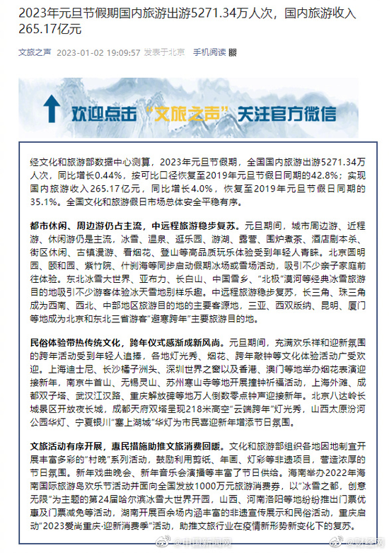 经文化和旅游部数据中心测算,2023年元旦节假期,全国国内旅游出游5271.34万人次,同比增长0.44%,按可比口径恢复至2019年元旦节假日同期的42.8%;实现国内旅游收入265.17亿元,同比增长4.0%,恢复至2019年元旦节假日同期的35.1%。全国文化和旅游假日市场总体安全平稳有序。
