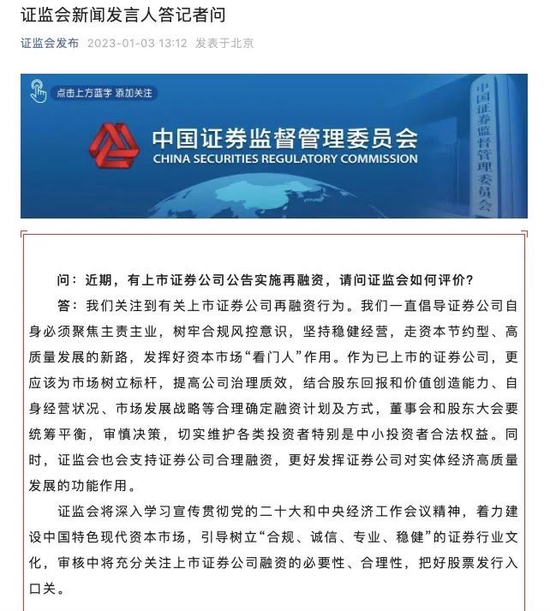 证监会表示,关注到有关上市证券公司再融资行为。证监会一直倡导证券公司自身必须聚焦主责主业,树牢合规风控意识,坚持稳健经营,走资本节约型、高质量发展的新路,发挥好资本市场“看门人”作用。作为已上市的证券公司,更应该为市场树立标杆,提高公司治理质效,结合股东回报和价值创造能力、自身经营状况、市场发展战略等合理确定融资计划及方式,董事会和股东大会要统筹平衡,审慎决策,切实维护各类投资者特别是中小投资者合法权益。同时,证监会也会支持证券公司合理融资,更好发挥证券公司对实体经济高质量发展的功能作用。