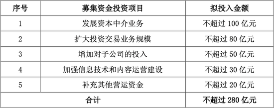 从募资投向来看,“资本中介业务”“自营业务”成为关键词。例如,中信证券280亿元配股方案中,计划投入不超过190亿元发展资本中介业务。中金公司不超过270亿元的配股方案中,拟将不超过240亿元投向包括但不限于资本服务与产品业务、投资银行业务、财富管理业务、私募股权业务、资产管理业务。
