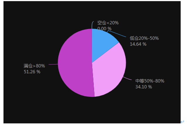 具体来看,仓位大于80%的股票私募占比升至59.57%,仓位小于20%的股票私募占比降至0.95%。另外中等仓位(50%≤仓位≤80%)和低仓位(20%≤仓位<50%)股票私募占比分别为27.19%和12.28%。