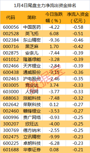 中国医药、英飞拓和东山精密等个股尾盘资金净流出最多,分别为0.58亿元、0.51亿元、0.46亿元。