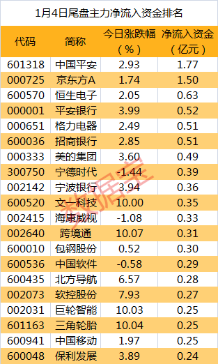 从个股尾盘资金流向数据看,有6股尾盘净流入资金超0.5亿元,中国平安、京东方A和恒生电子等个股尾盘资金净流入金额最多,分别为1.77亿元、1.5亿元、0.63亿元。