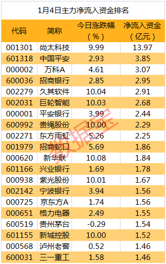 中国平安、万科A紧随其后,全天净流入资金分别为3.85亿元、3.07亿元;全天净流入资金较多的还有招商银行和久其软件等。股价表现方面,涨停的有巨轮智能、贵绳股份和新华联等。