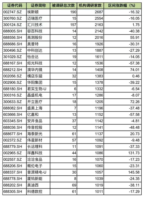 2022年,市场调研最密集的企业是从事机器人业务的埃斯顿(002747.SZ),全年累计接受190次2687家机构调研,几乎每次调研都有140家左右的机构慕名前来。机构看好这只个股,是看重中国疫情冲击背景下市场对于机器人业务市场前景,以及中国老龄化这一最大的时代背景。毕竟机器人不知疲倦,且不会感染病毒,可以在各种情况下保障生产的正常进行。不过,埃斯顿股价表现一般,全年下跌16.32%。