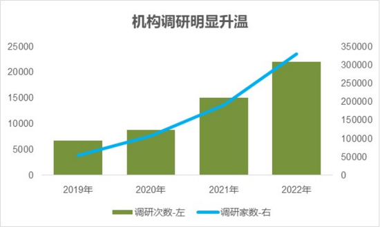 数据显示,机构2022年明显加强了个股的调研力度。2019年,机构调研次数累计6736次54085家(次),到了2022年,机构累计调研21928次约33万家(次)(如下图)。
