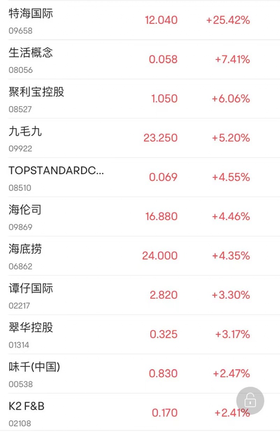 值得注意的是,今日餐饮股涨势明显,中资概念餐饮股表现尤其亮眼。九毛九涨超5%,海伦司涨4.46%,海底捞涨超4%,谭仔国际、翠华控股均涨超3%。