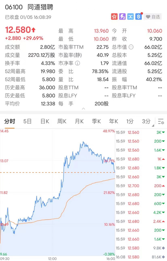 同道猎聘盘中暴涨36%,收盘仍有超30%涨幅,刷新半年新高,报12.58港元/股,最新总市值66.02亿港元。此外,另一招聘概念股Boss直聘涨超9%。