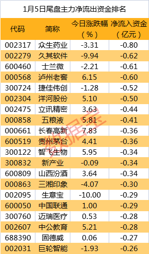 众生药业、久其软件和士兰微等个股尾盘资金净流出最多,分别为0.8亿元、0.62亿元、0.61亿元。
