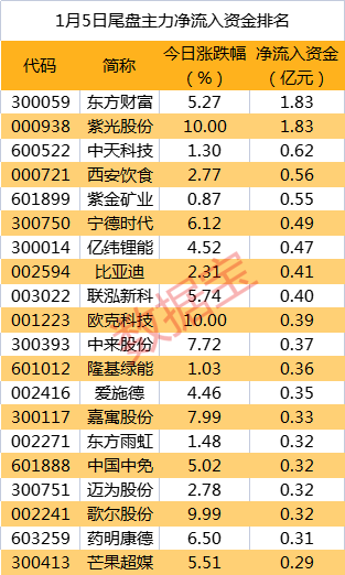 1月5日,上证指数涨1.01%,深证成指涨2.13%,创业板指涨2.76%。两市主力资金净流入126.24亿元,其中创业板净流入11.82亿元,沪深300成份股净流入135.94亿元。