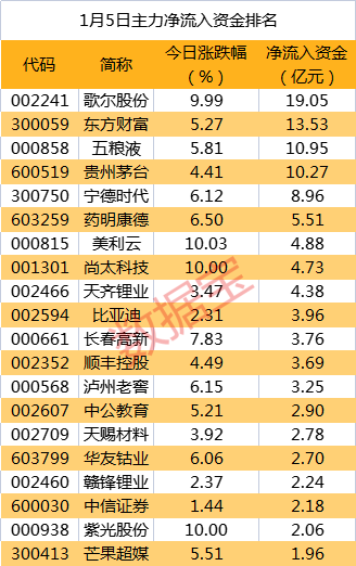 从个股来看,共有19股主力资金净流入超2亿元,消费电子龙头歌尔股份涨停,主力资金净流入19.05亿元居首。