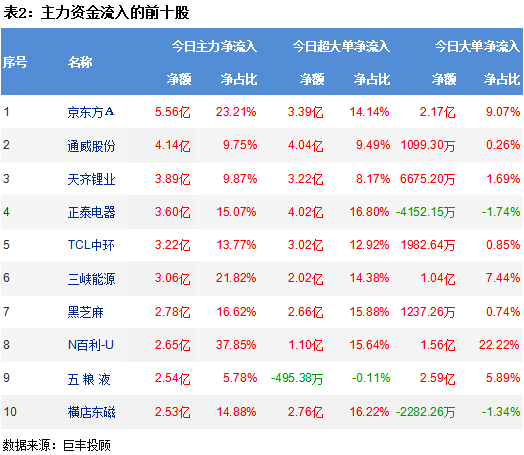 从两市个股主力资金流向来看,京东方A获主力资金净流入5.56亿,通威股份获主力资金4.14亿净流入,天齐锂业获主力资金净流入3.89亿,正泰电器获主力资金净流入3.60亿,TCL中环获主力资金净流入3.22亿。