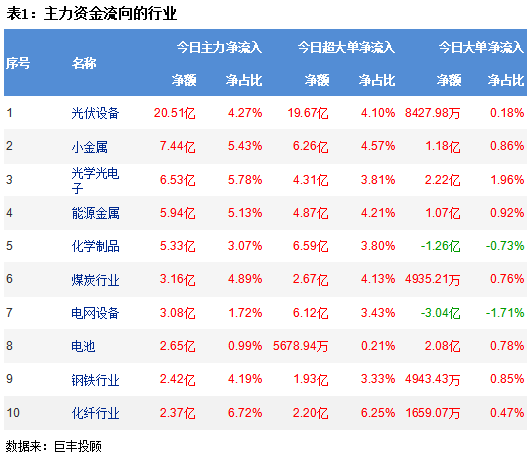 从两市行业板块资金流向来看,光伏板块获主力资金净流入20.51亿,小金属板块获主力资金净流入7.44亿,光学光电子板块主力资金净流入6.53亿,能源金属板块主力资金净流入5.94亿,化学制品板块主力净流入5.33亿。