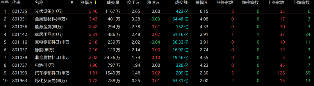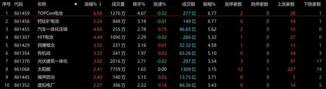 盘面上,申万二级光伏设备板块集体走强,金属新材料、能源金属、家居用品、家电零部件、橡胶、非金属材料、电池、汽车零部件等行业板块涨幅居前。概念股方面,TOPCon电池、钙钛矿电池、汽车一体化压铸、HIT电池等概念板块涨幅居前。下跌方面,广告营销、旅游及景区、影视院线等板块跌幅居前。