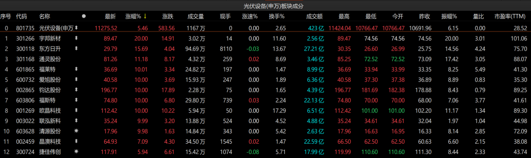 具体来看,宇邦新材20CM涨停,东方日升、通灵股份涨超10%,福莱特、爱旭股份、钧达股份、福斯特、欧晶科技、联泓新科、清源股份等多股涨停。
