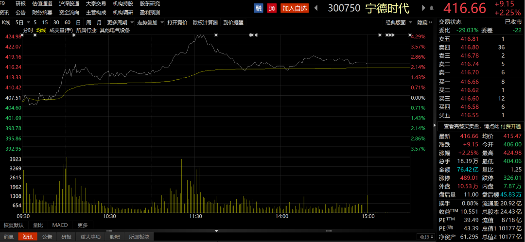 值得关注的是,盘中宁德时代涨超4%提振锂电池板块。截至当日收盘,宁德时代收涨2.25%,报价416.66元/股,最新市值10177亿元。
