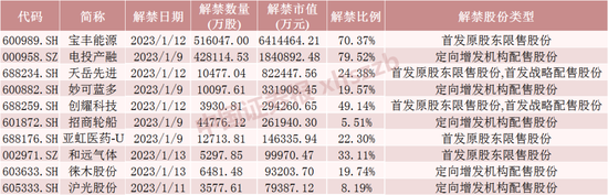 其中,宝丰能源1月12日将解禁51.60亿股,均为首发原股东限售股份;电投产融1月9日将解禁42.81亿股,均为定向增发机构配售股份;天岳先进1月12日将解禁1.05亿股,为首发原股东限售股份和首发战略配售股份。