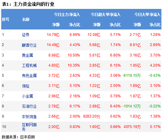 从两市行业板块资金流向来看,证券板块获主力资金净流入14.78亿,酿酒板块获主力资金净流入14.49亿,贵金属板块主力资金净流入8.98亿,工程机械板块主力资金净流入4.80亿,有色金属板块主力净流入3.72亿。