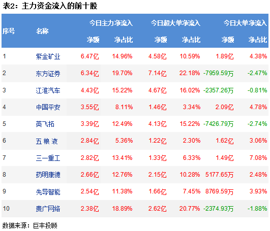 从两市个股主力资金流向来看,紫金矿业获主力资金净流入6.47亿,东方证券获主力资金6.34亿净流入,江淮汽车获主力资金净流入4.43亿,中国平安获主力资金净流入3.55亿,英飞拓获主力资金净流入3.39亿。