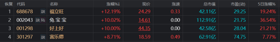 除了近日发酵的玄学“生肖行情”,今日多只名称“喜庆”的个股也表现活跃,与兔宝宝类似,这些个股同样为三字名称,其中,截止今日午间收盘,好上好封板涨停且获2连板,成为目前两市为数不多的连板股,福立旺涨幅超12%,富乐德涨幅也近9%。同时,这些个股在股吧的人气排名也直线上飚,截止今日发稿时,兔宝宝、好上好人气排名均在20位以内。有股民直呼:“真是太玄学了,看来名字好也是战斗力。”