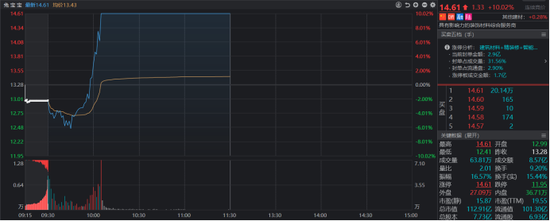 今日(1月10日)早盘,“建筑材料龙头股”兔宝宝盘中强势封板涨停,截止午间收盘,其获20.1万手近2.9亿元资金封单,仅半日成交额便达8.57亿元,股价也刷新2017年5月以来高点。