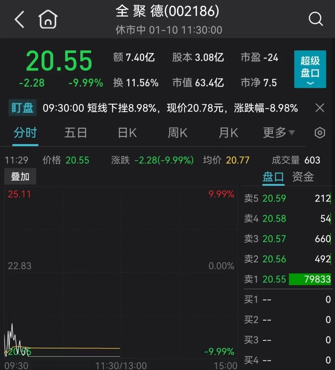 本以为会成为跨年妖股的全聚德,今日复牌,开盘即跌停,盘中一度开板,随后又快速封死跌停。截至发稿,该股报20.55元,跌停板上封单超8万手。
