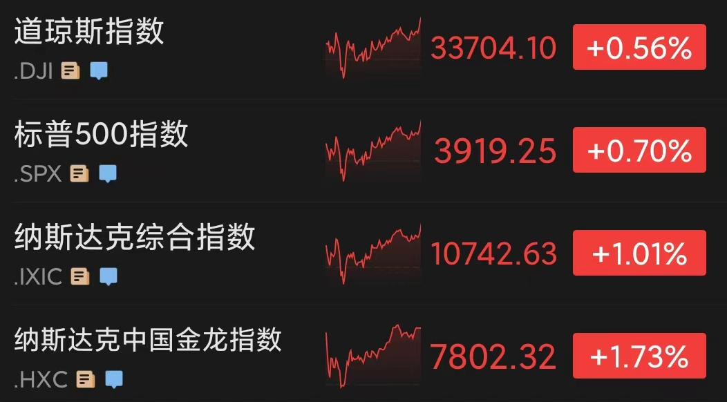 当地时间周二,美股三大指数低开高走,盘中小幅震荡,尾盘集体拉升。道指涨0.56%,报收33704.1点;纳指涨1.01%,收于10742.63点,录得“三连涨”;标普500指数涨0.7%,报收3919.25点。