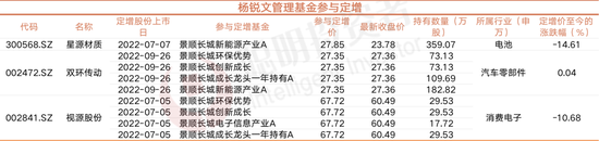 2022年,景顺长城杨锐文旗下管理的多只基金参与星源材质、双环传动、视源股份的定增,总金额达到2.92亿元。