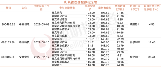 2022年,嘉实归凯旗下多只基金参与中科创达、泰坦科技、安井食品的定增,获配金额共记5.18亿元,分别为1.05亿元、8999.99万元、3.23亿元。