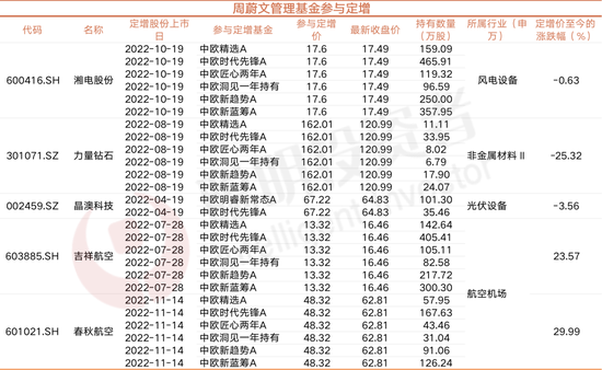 2022年,中欧基金周蔚文旗下管理的多只基金参加湘电股份、春秋航空、吉祥航空、晶澳科技、力量钻石的定增,认购总金额达到9.29亿元。