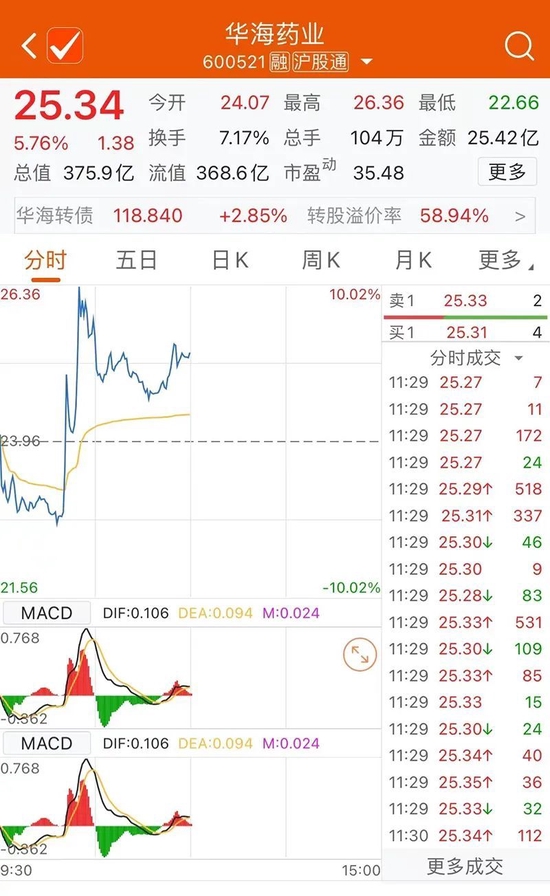 今日,华海药业早盘低开,随后盘中突然拉升,一度冲击涨停,截至收盘,华海药业涨逾5%。