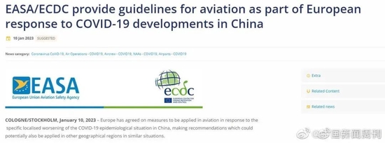 欧洲航空安全局与欧洲疾控中心当地时间1月10日发布联合声明,宣布欧洲已就中国相关航空措施达成一致,在两家机构联合发布的《航空健康安全议定书》中增加部分建议。