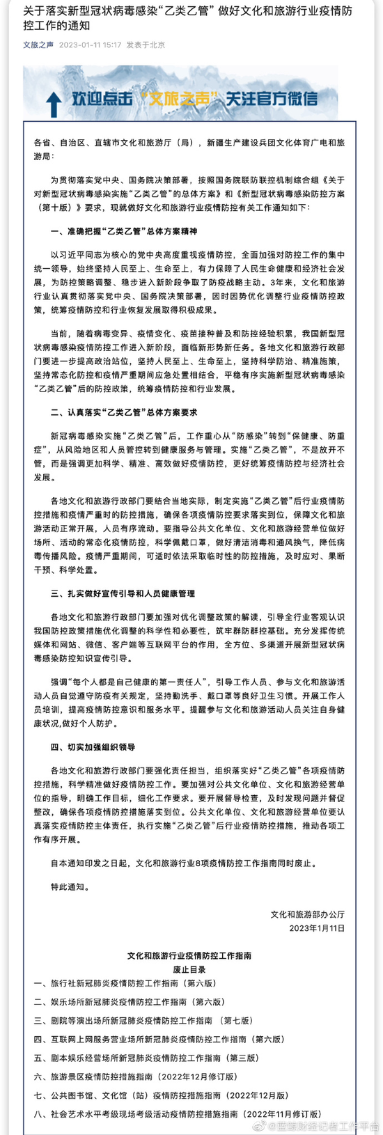 文化和旅游部办公厅发布关于落实新型冠状病毒感染“乙类乙管”,做好文化和旅游行业疫情防控工作的通知。其中提到,各地文化和旅游行政部门要结合当地实际,制定实施“乙类乙管”后行业疫情防控措施和疫情严重时的防控措施,确保各项疫情防控要求落实到位,保障文化和旅游活动正常开展,人员有序流动。自本通知印发之日起,文化和旅游行业8项疫情防控工作指南同时废止。