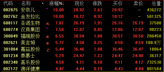 辅助生殖概念亦有所表现,圣诺生物、汉商集团涨超7%,奥瑞特、澳洋健康涨超4%。