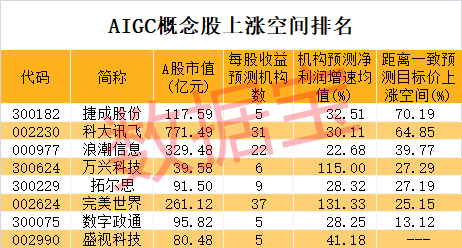 机构最青睐的AIGC概念股是哪只?数据宝统计,机构评级家数最多的是完美世界,共37家机构给予其积极型评级。其次是科大讯飞、浪潮信息等。按照5家以上机构一致预测,机构预测2022年-2024年净利润增速均超10%的股票有8只。最新估值水平来看,浪潮信息、捷成股份、完美世界等3股滚动市盈率低于30倍。